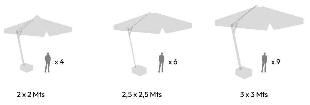 Quitasol fabricado con pie lateral o central en fierro con pintura electroestática para exterior con lona polyester 100% impermeable con filtro UV y opción de estampado en vinilo textil para exterior, base de cemento o plancha de fierro para anclaje.
